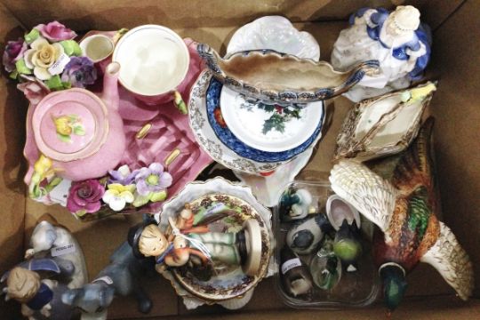Assorted ceramics including ornaments, vases, plates, cake plate, etc. (4 boxes)