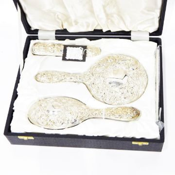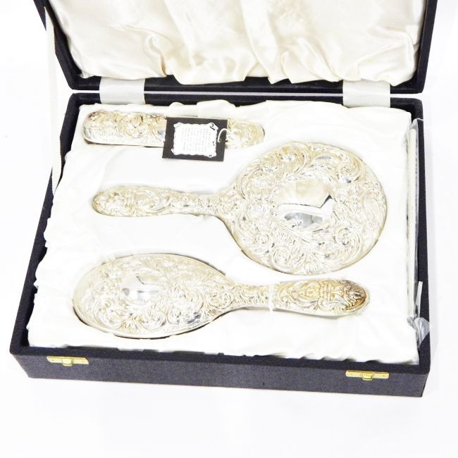 Modern silver dressing table set, 4 pieces : mirror, brush, clothes brush and comb, all scroll and mask repousse, Birmingham 1982, cased