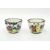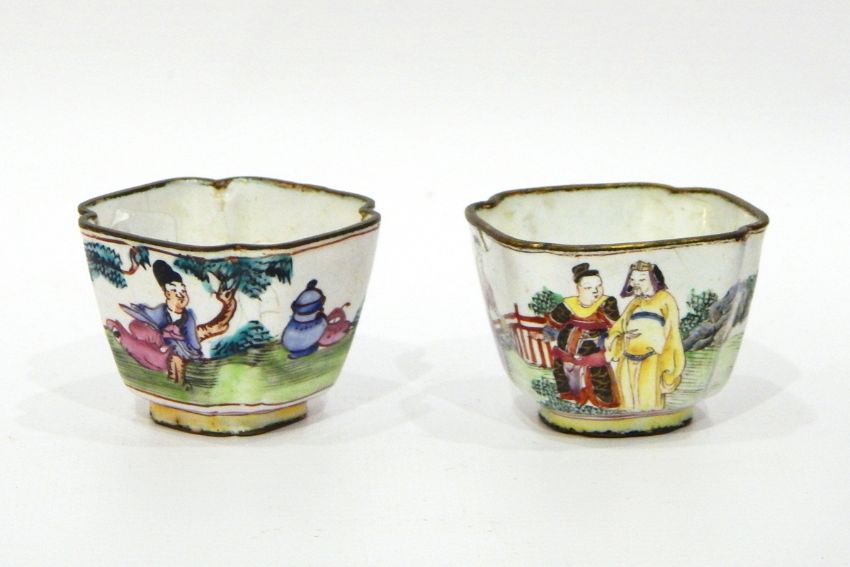 Pair of 18th century Chinese Canton enamel tea bowls and saucers, square form, decorated with figures (damage to enamel)