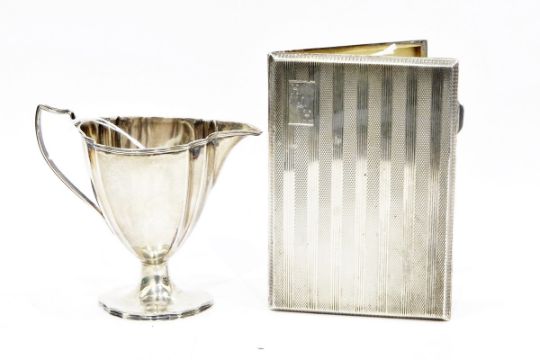 Silver cigarette case of engine turned rectangular form, Birmingham 1943 and a silver cream jug, Birmingham 1919, 8oz (2)