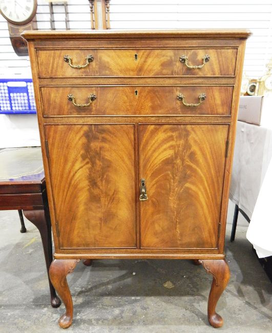 Pair of mahogany cabinets and contents of plated cutlery, each fitted with two drawers over a pair of cupboard doors on cabriole supports, the drawers containing a silver plated Dubarry pattern set of flatware comprising 8 table knives, 8 cheese knives, 8 soup spoons, 8 dessert spoons, 7 dessert forks, 8 pairs of fish eaters, 12 teaspoons, 12 table forks, 6 tablespoons and various bone handled knives, each cabinet, 64cm wide