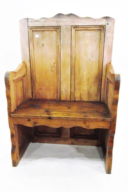 Old pine panel-back seat with downswept arms and solid seat, width 74cm