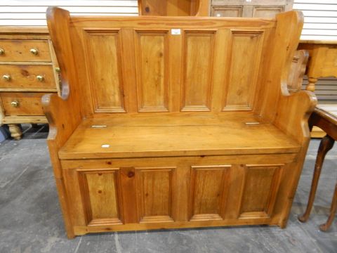 Small pine settle with full panelled back, the hinged box seat enclosing compartment, width 98cm