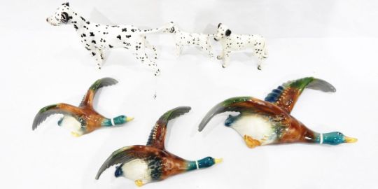 Graduated pair of Beswick dalmatians including 'Arnoldene' together with another similar, three graduated Beswick-style duck wall plaques (crudely repaired wings to duck, duck model broken beak and base, etc) (7)