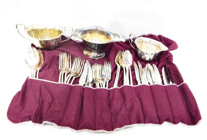 Angora silver-plated flatware service, a Dunhill silver-plated lighter of engine turned rectangular form in original fitted case, a silver plated sauceboat and stand and various other items
