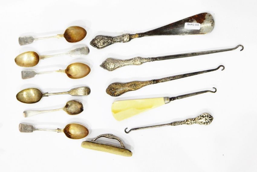 Two button hooks with silver handles, one decorated with a cherub's head, a set of three Victorian provincial silver fiddle pattern teaspoons by Josiah Williams & Co, Exeter 1858, another probably by William Welch and various other teaspoons, etc.