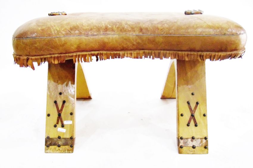 Camel-style stool with leather cushion and an Eastern mother-of-pearl inlaid table of hexagonal form (2)