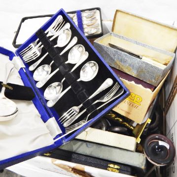 Assorted silver plated flatware, a silver plated teaset, etc.
