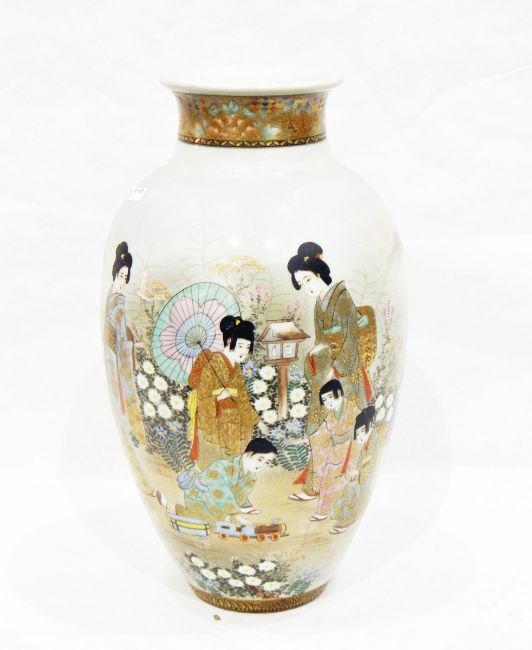 Japanese porcelain vase, ovoid and painted with figures in garden, child playing with toy train, signed, 35cm high