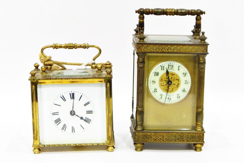Carriage clock in ornate brass case, with bevelled glass panels, enamel dial inscribed 'Bishop & Son, Trowbridge' and another carriage clock of squat proportions, in brass case (2) (PLEASE NOTE NEW ESTIMATE)