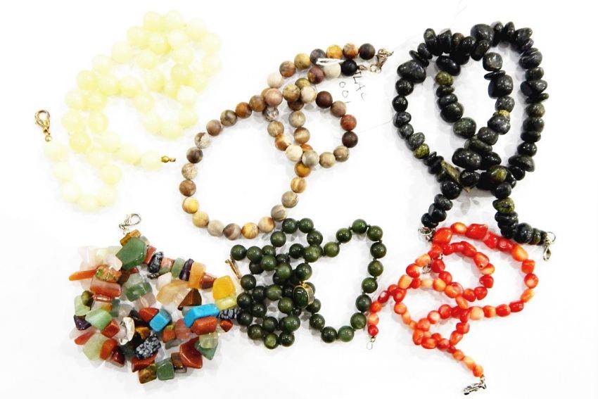 Jade bead necklace, sundry agate and hardstone necklaces, jade and other loose pieces