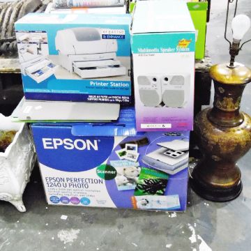 Multi-media speaker system (boxed with instructions), a printer station stand with built-in storage (boxed), an Epsom Perfection 1240U photo printer (boxed with instructions) and an Eastern-style painted wooden table lamp