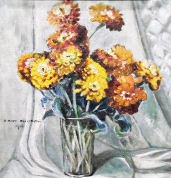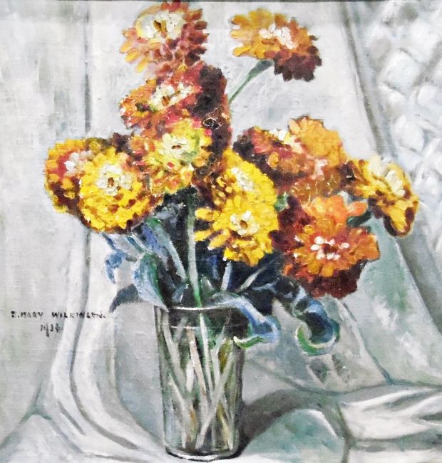 Emma Mary Wilkinson (1864)Oil on canvasHollyhocks and carnations in a jug, signed and dated 1935 lower right, 53cm x 45cm, another by the same artist of sunflowers in a glass vase, 39cm x 31cm, signed lower right and a third by the same artist of zinnia in a glass vase, signed and dated 1936 left centre, 42cm x 42cm (3)