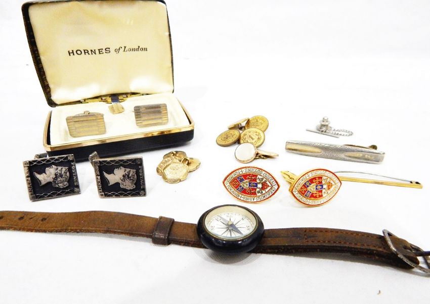 Pair of Victorian rolled gold cufflinks of lobed design with engraved decoration, various other cufflinks, a compass mounted on a leather strap, etc.