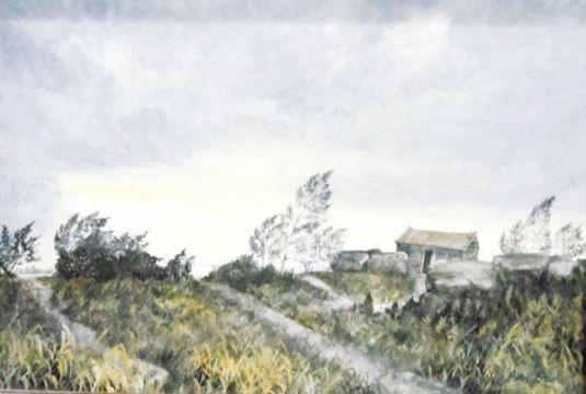 Alan Stuttle (b. 1972) Oil on canvas "Sketch of Storm over Brixham 1976", brooding windy landscape with hut, signed and entitled verso, 24cm x 34cm