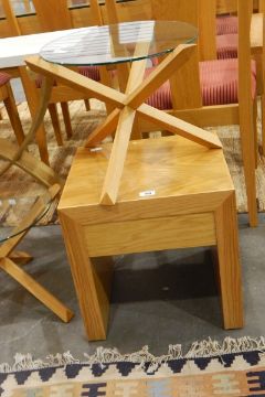 Alexander Miles Furniture Company oak square occasional table stool, with frieze drawer on stile supports, width 33cm and a pair of Alexander Miles Furniture Company circular plate glass topped occasional tables, on oak cross framed supports, diameter 40cm (3)