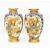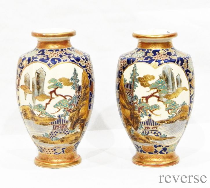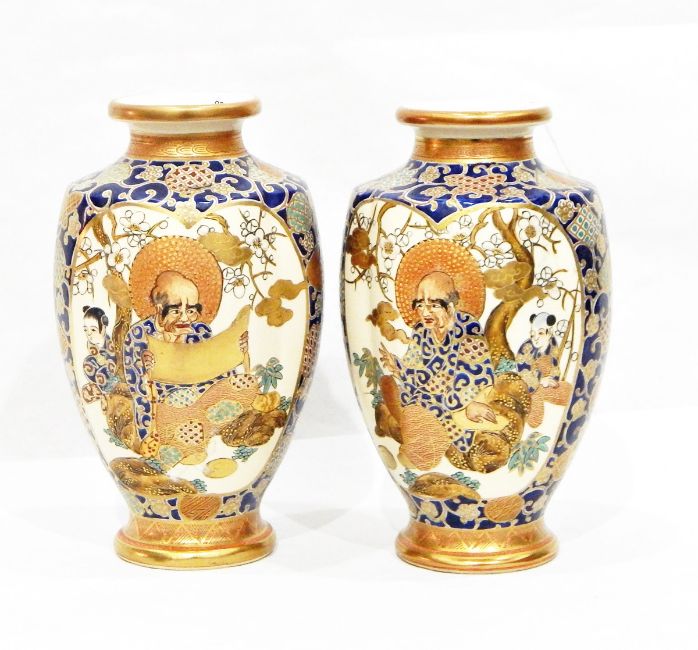 Pair of Satsuma Shimazu earthenware vases, ovoid and shouldered, slightly lobed, having lobed panels of immortal with boy and lakeside landscape, 20cm high (2)
