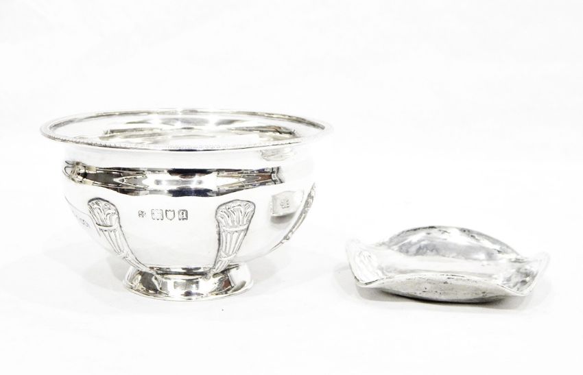 Silver sugar bowl by Josiah Williams & Co, London 1915, of circular form, the body with applied flaming torch decoration, with gadrooned rim, on collet foot, 10cm diameter and a Peruvian silver ashtray, marked 'J Tava 925', 7cm square, 6oz (2)
