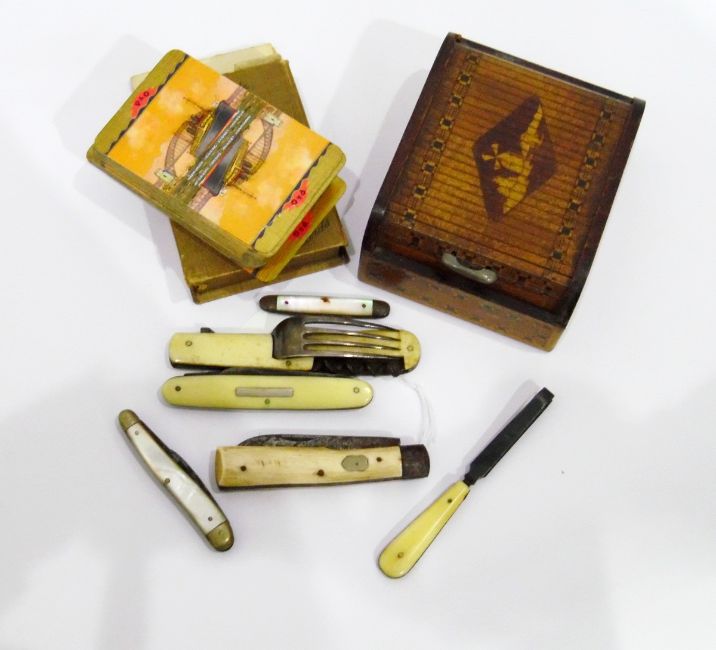 Victorian ivory and silver plated folding fork with corkscrew attachment, two mother-of-pearl folding fruit knives, other penknives, a pack of playing cards and a parquetry box with tambour cover (8)