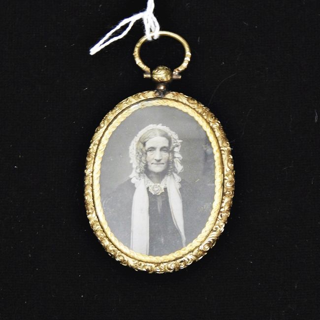 Victorian ornate pinchbeck/gold-plated glass locket with ambro-type portrait photograph