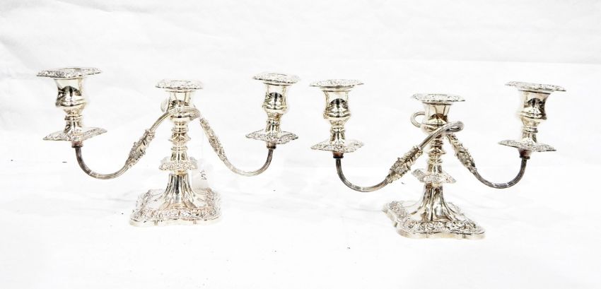 Pair of silver-plated two-branch candelabra with scroll supports on shaped square bases decorated with flowers, 18.5cm high