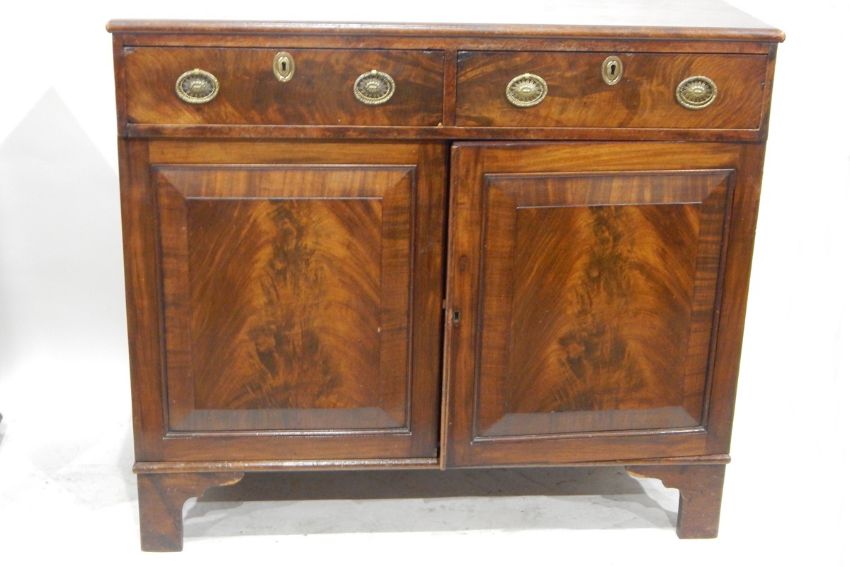19th century dwarf mahogany side cabinet having two drawers over two field panelled doors, on bracket feet, 103cm wide