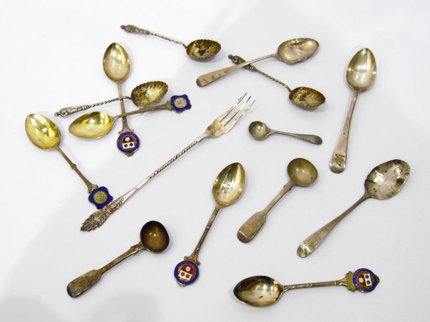 Quantity of silver teaspoons including enamel souvenir examples, apostle finial examples, a Georgian mustard spoon, etc.