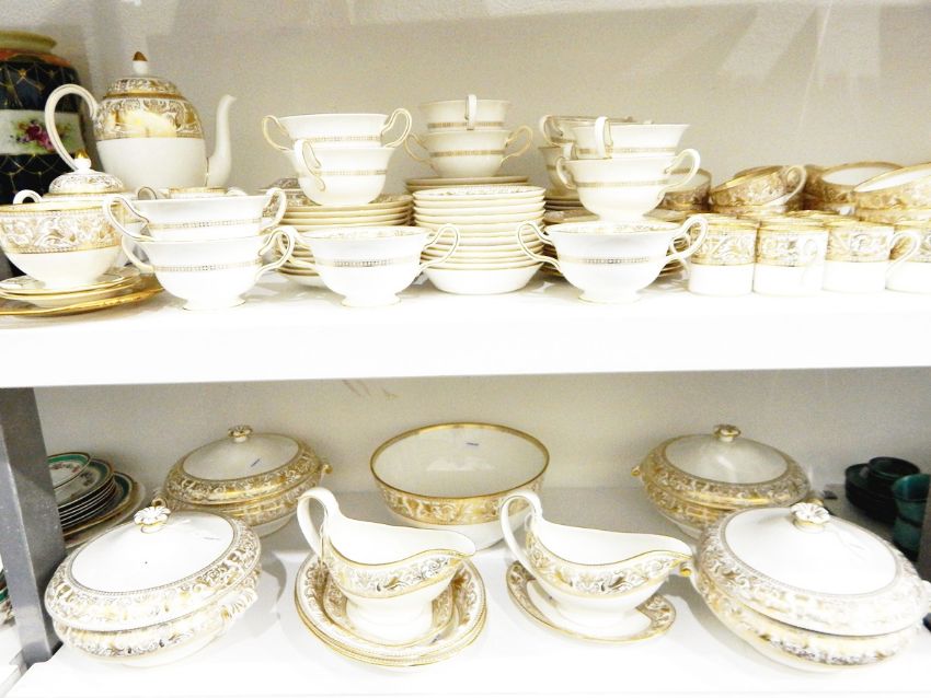 Large Wedgwood bone china dinner, tea and coffee service 'Gold Florentine' pattern W4219 to include tureens, large bowls, sauce boats and stands, serving dishes, graduated plates, meat plates, coffee pot, cans, teapot, teacups, ashtrays, etc.