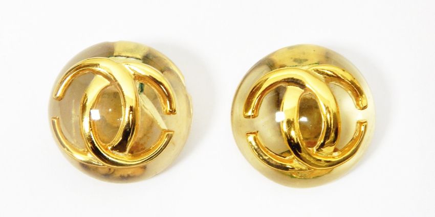 Pair of Chanel perspex clip-on earrings, the large perspex cabochons with the intertwined 'C' logo, 3cm diameter, in Chanel box (some damage)
