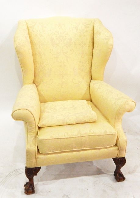 Upholstered wing side easy chair on squat carved cabriole supports with claw and ball feet