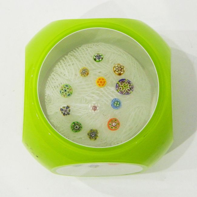 John Deacons purple and white cased cushion paperweight with faceted windows having scrambled white canework latticinio interior and Scottish rose, 6cm high and a green and white cased glass paperweight of shaped rectangular form, having scrambled canework interior with millefiori detailing, 6.6cm high (2)