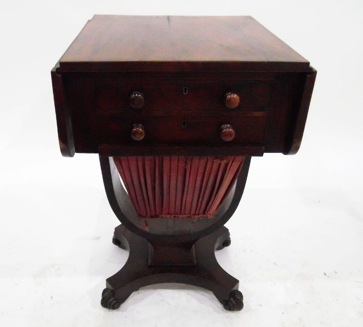 Victorian mahogany drop flap sewing table, with two frieze drawers, and wool compartment below faced with pleated silk, on a square column support platform base with scroll feet, width 43cm