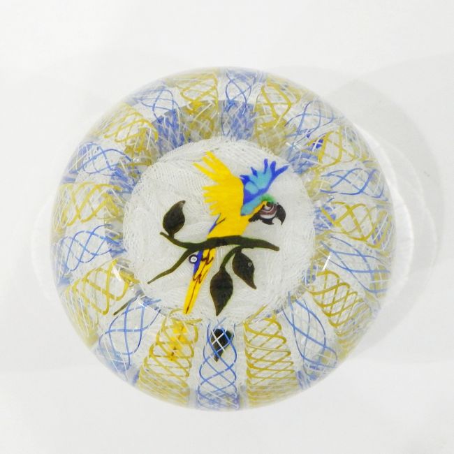 John Deacons circular paperweight having yellow, white and blue spiral latticinio canework to outer, with scrambled white canework to centre overlaid by parrot with 'JD' mark beneath, having integral shaped pedestal base, sticker to base, 10cm high and a John Deacons purple and white cased glass double-overlay cushion paperweight with faceted viewing windows, having scrambled white canework interior with purple hibiscus flower, 6cm high