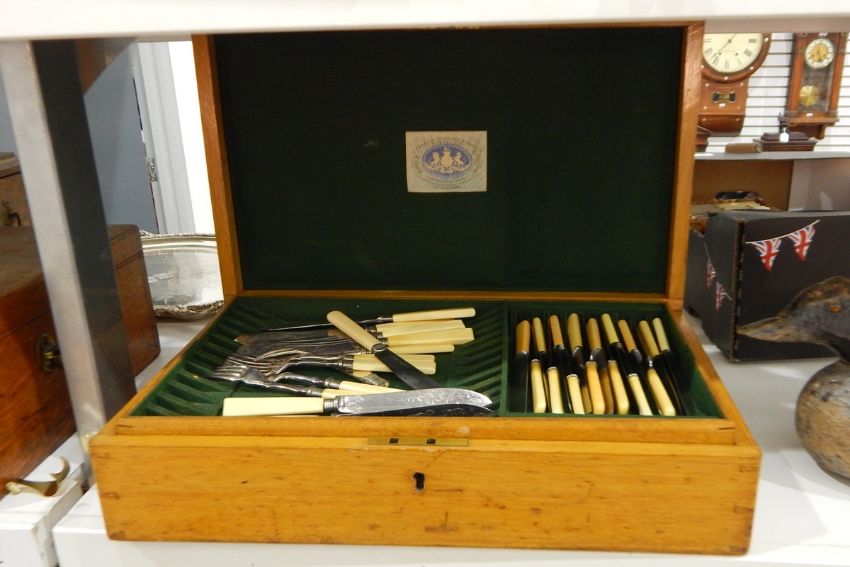 Oak table canteen containing sundry EPNS and yellow-handled table flatware, various