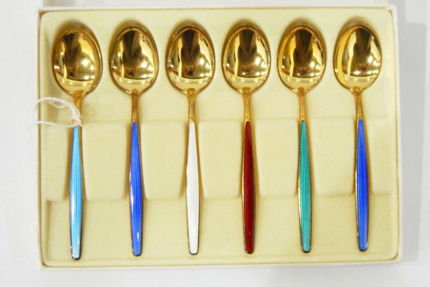 Pair of Norwegian silver-gilt and enamel coffee spoons having harlequin enamel handles, boxed