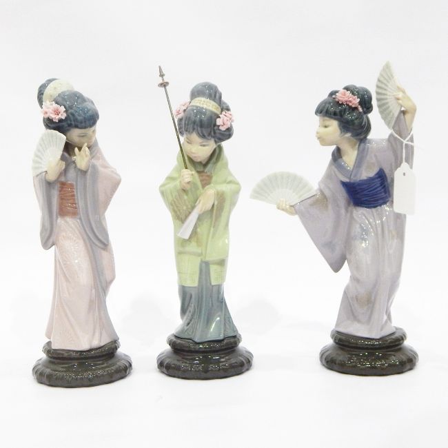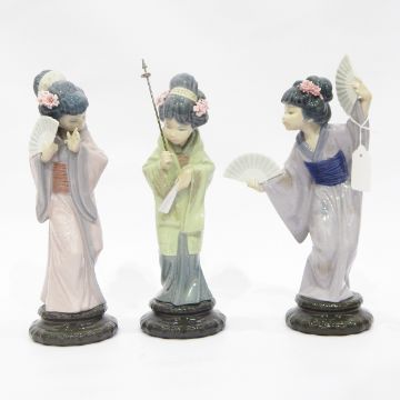 Two Lladro figures of Oriental ladies with fans together with another raised on a socle base (3)
