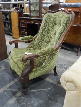 Victorian mahogany framed open arm easy chair with button upholstered back, padded arms and on turned supports