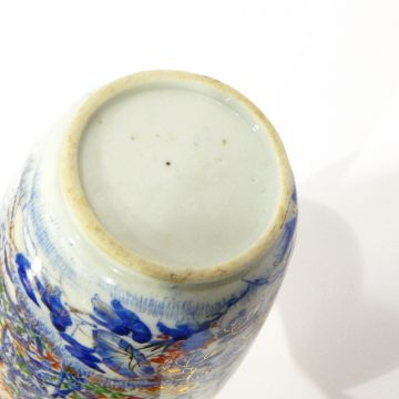 Pair of late 19th/early 20th century Japanese vases of baluster form decorated in blue and white with plants, flowers and birds, highlighted in polychrome and gilt, 19cm high (one heavily restored)