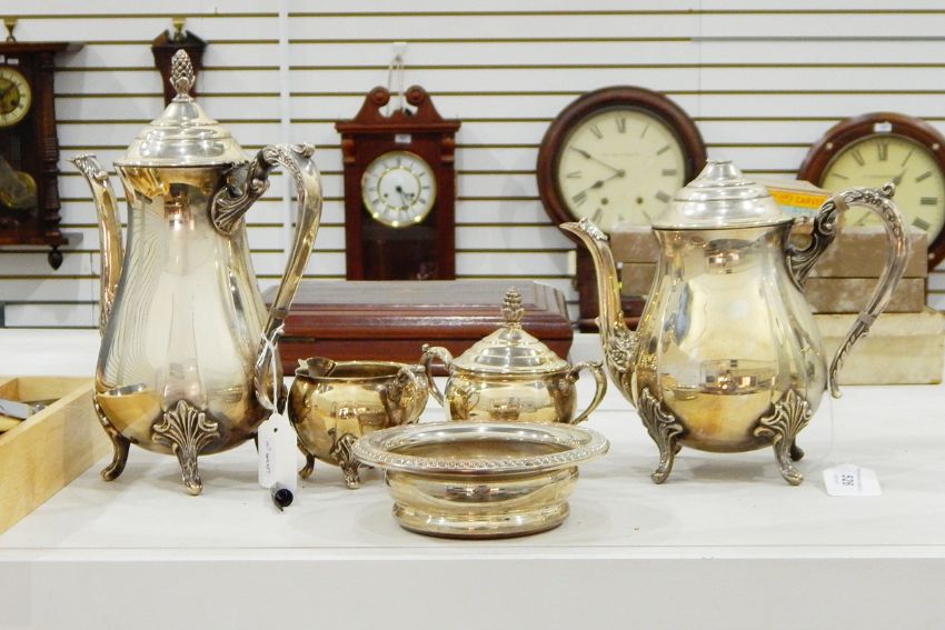 EPNS tea service, plated wine coaster with turned wood base and a quantity of table flatware