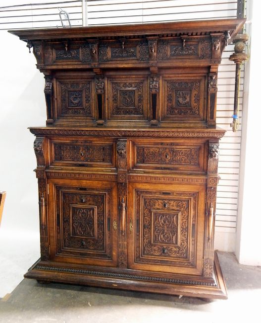19th century Renaissance revival carved oak court cupboard, with overall strapwork decoration with carved mask capitals, the upper section with three cupboards, the upper section with three cupboards, two drop front cupboards below with a further pair of large cupboards, on a bead bordered base, raised on bun feet, width 164cm
