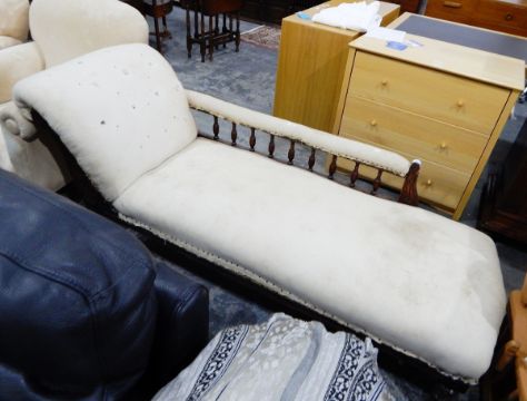 Late Victorian chaise longue with turned spindle gallery, single scroll back and on turned supports