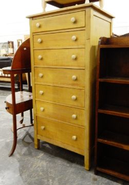 Seven-drawer pedestal painted pine chest, an early 20th century white-painted two-tier occasional table and a 19th century pierced brass trivet (3)