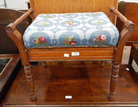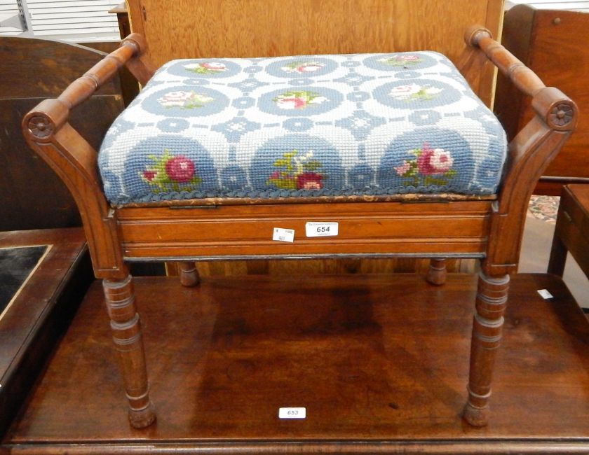 Edwardian box-seat piano stool on turned supports and with woolwork embroidered pad seat