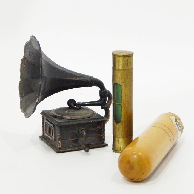 Portable brass spirit level, boxwood container and a pencil sharpener in the form of a gramophone player