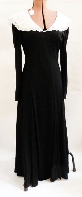 Magdalen Jebb 1980's silk evening suit with full-length skirt, bodice with peplum, puffed sleeves, a black crepe full-length evening dress with a white lace collar, two Belville Sassoon ball gowns, one turquoise and silver with peplum, strapless, puff sleeves and a black and white net ball gown with bow details, puff sleeves, appliqued little plastic daisies and appliqued flowers to the sleeves (4)