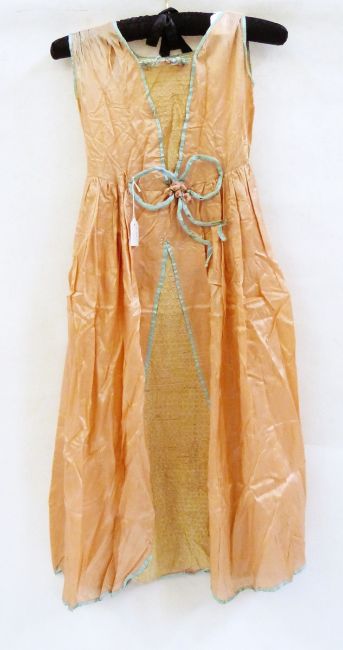 Child's dressing up outfit with yellow satin skirt trimmed with jet beads and black lace and a black velvet trimmed waistcoat, a vintage silk child's dress, lace inset to bodice and skirt, a white wig and faux-flower decorations