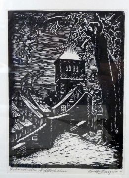 Kenneth Lindley (20th century) Woodcut "The Two of Us", titled, signed and numbered 28/75 in pencil, 14cm x 21cm Miriam Macgregor (20th century) Woodcut "A Womans' Work", signed, titled and numbered 31/50 in pencil, 14.5cm x 22cm Fritz Bayer (20th century) Woodcut "Hildesheim", 19.5cm x 13.5cm Bromley (20th century) Woodcut Rushing for a plane, 13cm x 16cm Derek Crowe (20th century) Pen and ink Seated soldier smoking an illustration for 'How I Liberated Burgandy' by Wynfred Vaughan Thomas, published by Michael Joseph 1985, 15cm x 17cm (5)