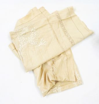 Oriental embroidered silk wall hanging panel, decorated with figures and symbols, red silk ground and backed with linen, 47cm x 108cm (damaged)