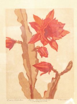 William T Rawlinson (1912-1933) Woodcut "The Card Players", signed, titled, dated '34 and numbered 4/20, 10cm x 12cm Ernst Rotteken (German 1882-1945) Linocut in colours "Roter Blatterkaktus", signed and titled in pencil, 24.5cm x 18.5cm (2)