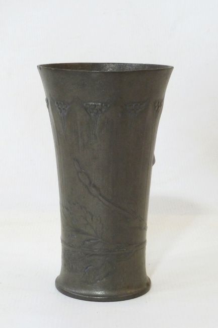 Kayserzinn pewter vase of flared circular form decorated with a trailing hop and stylised leaf decoration, marked '4214' to base, 14cm high
